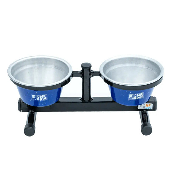 Comedouro Premium NF Pet AzulO Comedouro Premium NF Pet Azul é um comedouro duplo suspenso com regulagem de altura dando bastante conforto ao pet na hora da alimentação.Possui base de aço (com pintura eletrostática craqueada) e bacias em alumínio (que podem ser pintadas ou não). Produto de extrema resistência muito duradouro de design diferenciado este comedouro foi pensado para os donos de pet que preferem manter a ração e a água separados. Como tem base elevada do chão leva melhores condições de saúde e higiene para o animal.O recipiente pode ser retirado da base proporcionando fácil higienização.Tamanhos disponíveisFilhote – Capacidade: 500 ml (Não possui ajuste de altura)Mini – Capacidade: 120 L (06 cada) / Altura min.: 14 cm Altura máx.: 195 cmPequeno – Capacidade: 3 L (15 L cada) / Altura min.: 24 cm Altura máx.: 37 cmMédio – Capacidade: 5 L (25 cada) / Altura min.: 30 cm Altura máx.: 47 cmGrande - Capacidade: 72 L (36 cada) / Altura min.: 34 cm Altura máx.: 53 cm