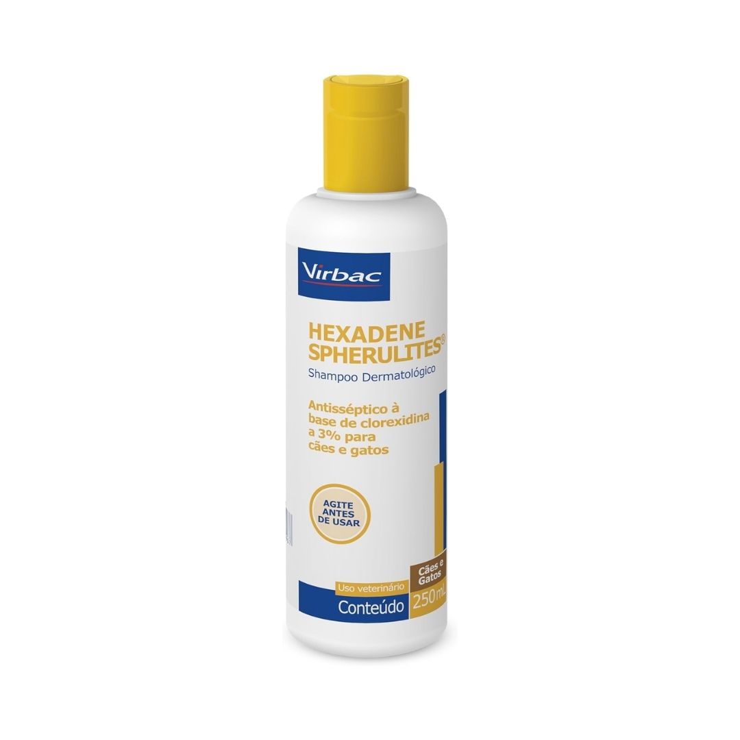 Shampoo Hexadene SpherulitesO Shampoo Hexadene Spherulites é um produto voltado a tratar e a prevenir infecções na pele causadas por bactérias e fungos.Com a tecnologia exclusiva da Spherulites o produto tem como base a clorexidina substância com atividade asséptica-desinfetante bastante utilizada pela Medicina Veterinária.Como aplicar o Hexadene?Um dos principais atrativos deste produto está na facilidade de sua aplicação. Afinal apesar de ter ação medicamentosa sua aplicação é muito parecida com a de um shampoo regular.Para aplicá-lo o tutor deve espalhar Hexadene Shampoo por todo o corpo do pet massageando a solução até que ela faça espuma. Após isso deve-se enxaguar e refazer o processo desta vez deixando o produto agir por 10 minutos até realizar um novo enxágue.Quanto à frequência e extensão do tratamento a recomendação geral é que o shampoo seja aplicado duas vezes por semana até que os sintomas desapareçam.Quais são os cuidados exigidos pelo produto?Como todo shampoo é preciso um cuidado especial com os olhos e as mucosas dos cães e gatos. Isso porque essa é uma área sensível e pode se irritar no contato com o produto.Outra questão importante para ficar atento é a possibilidade de surgimento de irritações na pele de animais hipersensíveis a alguns componentes do Hexadene.Ao perceber sintomas como vermelhidão o tutor deve interromper o tratamento e consultar um veterinário de confiança.Afinal o Shampoo Hexadene é bom para o meu pet?As infecções de pele causadas por bactérias e fungos podem afetar significativamente a qualidade de vida de cachorros e gatos.Quando não tratadas da maneira correta elas podem causar coceira intensa feridas e até mesmo queda de pelo.Daí vem a importância deste produto um dos produtos mais recomendados pelos veterinários para o combate das doenças dermatológicas desta natureza.Portanto para aqueles que perguntam se o Shampoo Hexadene é bom a resposta é: sem dúvida! Ele é um aliado para lá de eficiente para tratar e prevenir seu amigo peludo dessas situações incômodas.O que diz o Hexadene Shampoo em sua bula sobre restrições de aplicação em determinados animais?A bula do Hexadene deixa muito claro que sua destinação se limita apenas a cachorros e gatos. Sendo assim ele não deve ser aplicado em outras espécies de pets.Para o público que se destina no entanto o Hexadene não apresenta nenhuma restrição e pode ser administrado em cães e felinos idosos adultos ou filhotes.Hexadene Shampoo: qual é seu preço?O histórico de sucesso no tratamento de infecções de pele causadas por bactérias e fungos por si só faz do Hexadene um produto de ótimo custo-benefício. Afinal seus impactos positivos na qualidade de vida de cães e gatos com problemas dermatológicos são inquestionáveis.Além disso aqui na você encontra os melhores preços e ainda pode ganhar descontos exclusivos!Para comprar o Shampoo Hexadene Spherulites com desconto basta fazer uma Compra Programada . Escolha a frequência que você preferir o local da entrega e garanta 10% OFF.Ao se tornar um assinante você acumula pontos com o Amigo e pode trocar por descontos ou brindes exclusivos.